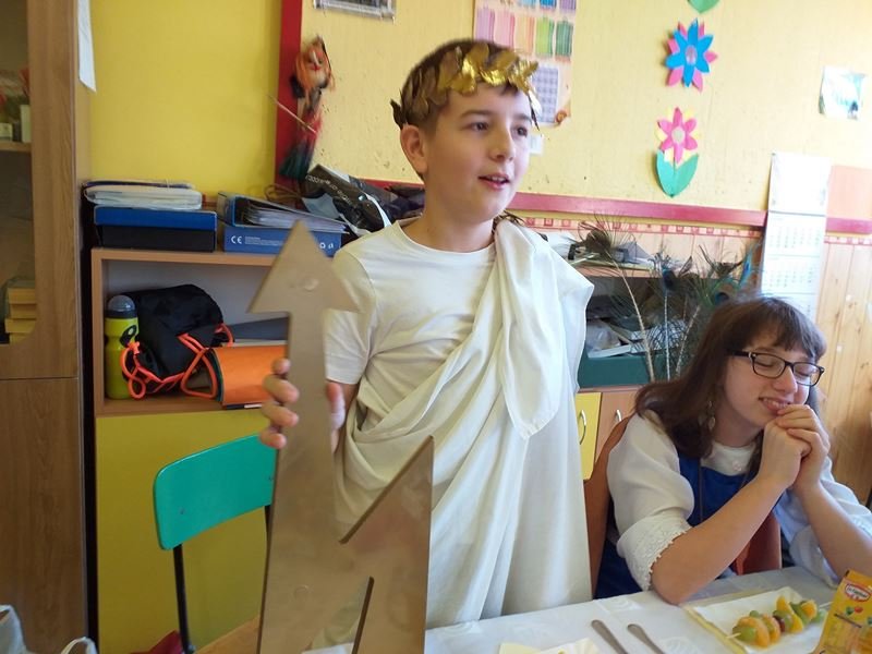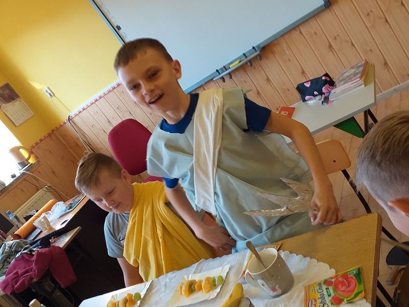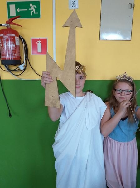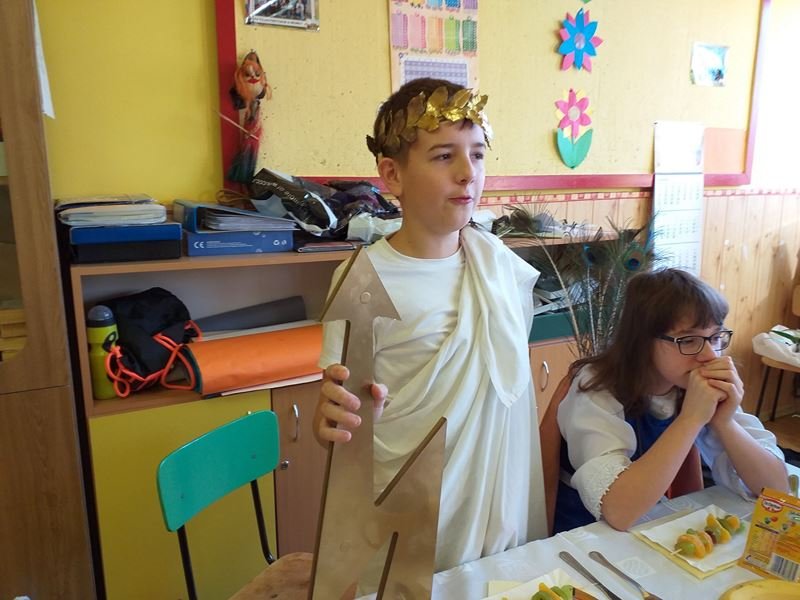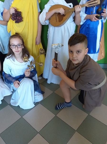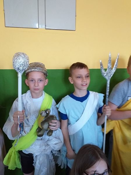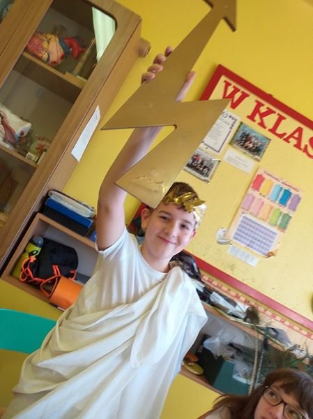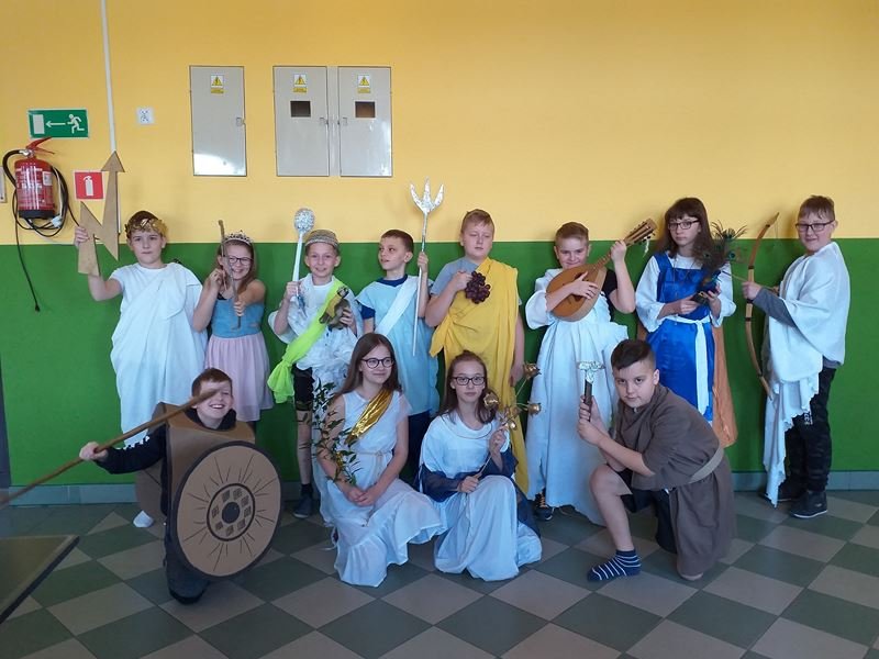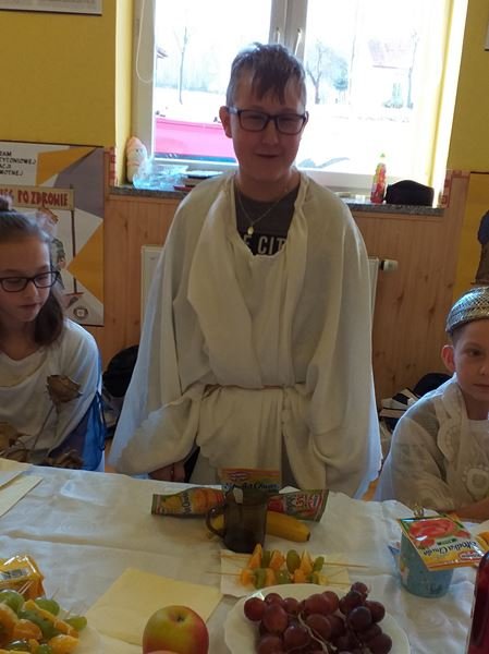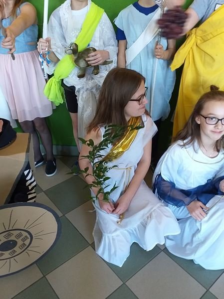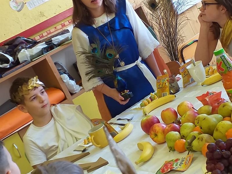 Na ten moment czas się zatrzymał, aby nikt nie przeszkadzał bogom w świętowaniu. Przy suto zastawionym stole, gdzie królował nektar i ambrozja zasiedli uczniowie ubrani w boskie szaty z przygotowanymi atrybutami przedstawiającymi dziedziny, którymi się opiekują. Tak więc Zeus przywitał zebranych z piorunem w dłoni i wieńcem laurowym na głowie. Hera przybyła w asyście królewskiego ptaka , Atena trzymała gałązkę oliwną , Demeter łuk, a Afrodyta złotą różę. Bogowie Eros, Hades , Dionizos, Posejdon, Apollo, Ares i Hefajstos równie „ bosko” prezentowali się w swoich strojach. Po części oficjalnej Zeus zaprosił wszystkich do ucztowania. Kiedy wyczerpały się tematy rozmów , wszystkie bieżące sprawy świata zostały omówione, uczta dobiegła końca . Ja jako osoba patronująca temu wydarzeniu chciałam podziękować uczniom kl. 5 za tak odpowiedzialne i pełne zaangażowania przygotowanie tej nietypowej lekcji historii. Dziękuję za merytoryczne wystąpienia, oryginalne stroje i atrybuty, wyśmienite jedzonko. Myślę że był to miło i pożytecznie spędzony czas zajęć dydaktycznych.