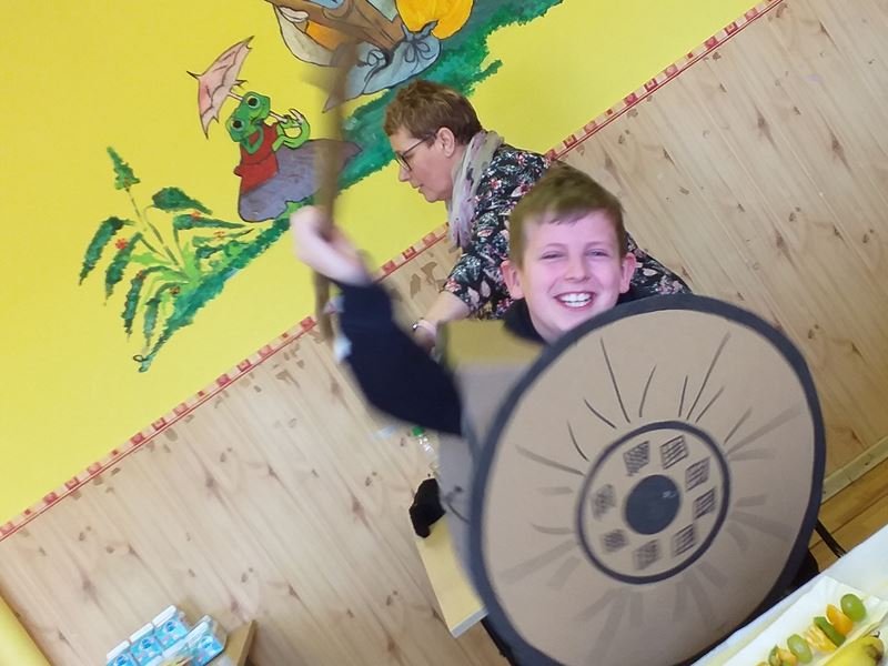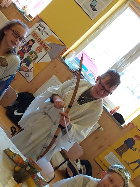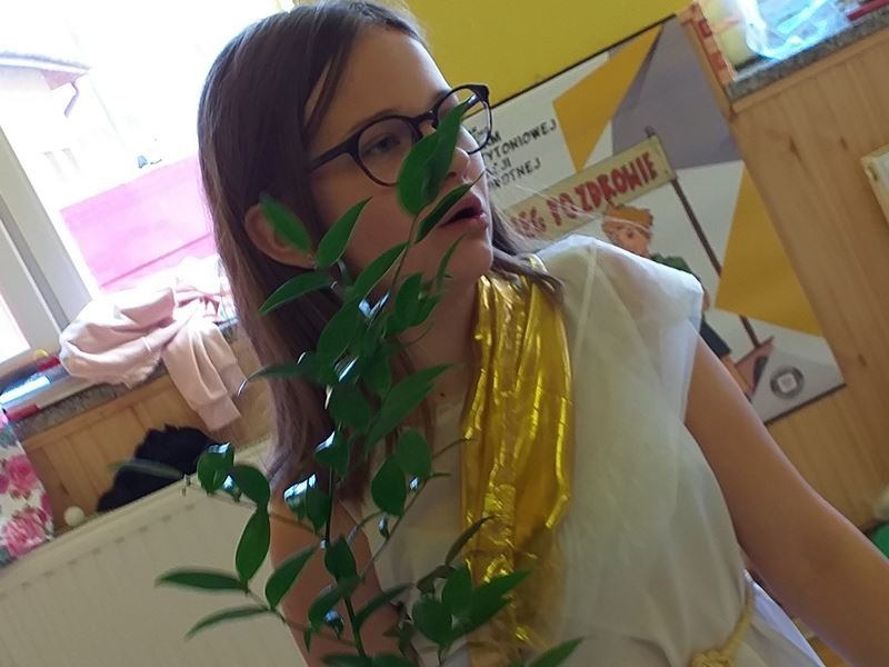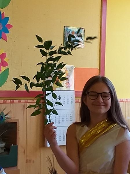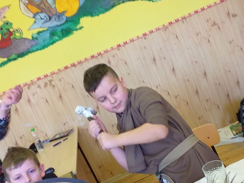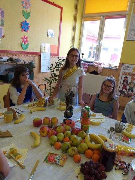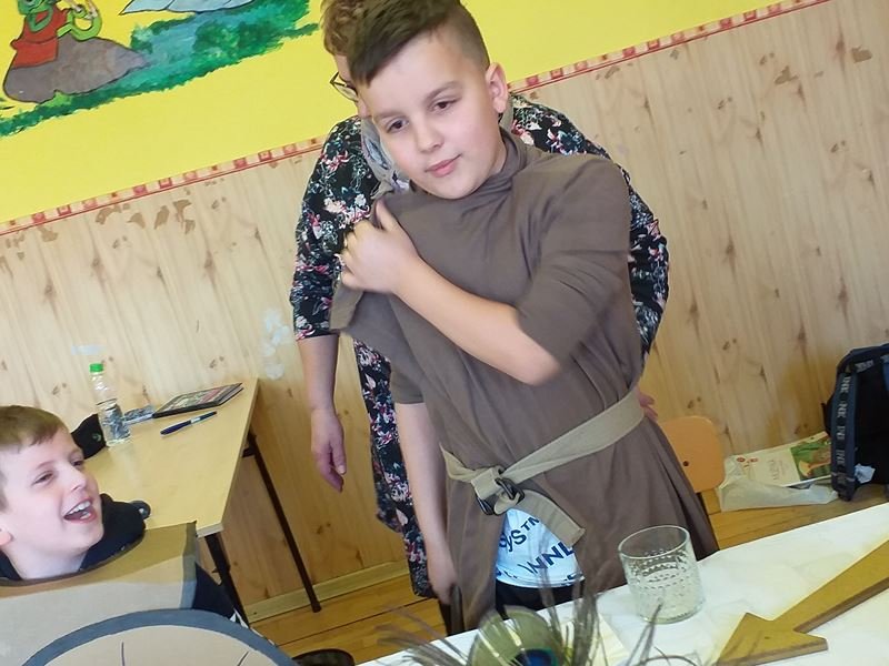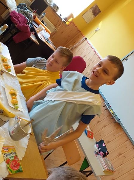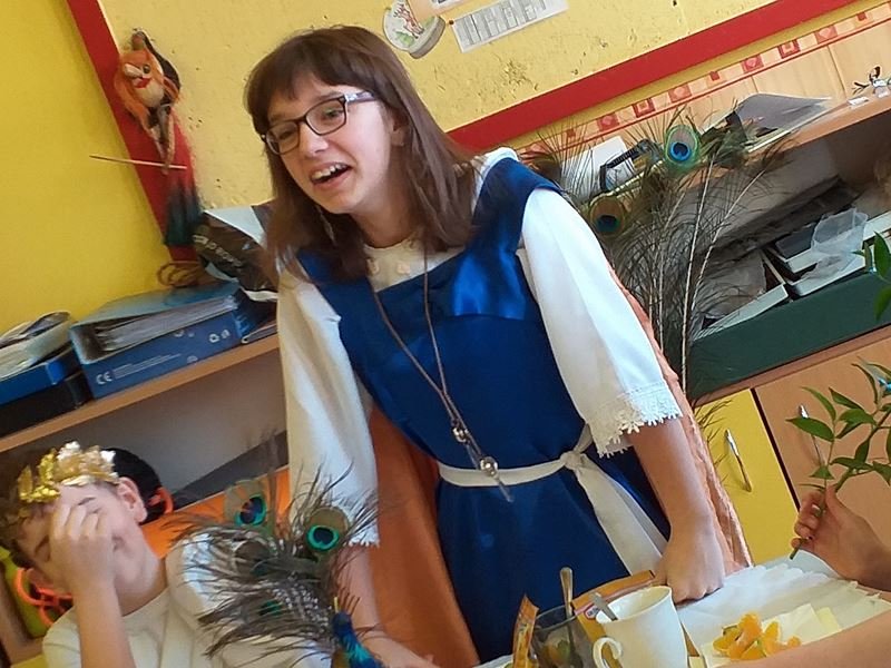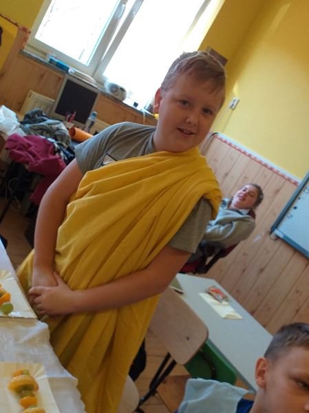 Na ten moment czas się zatrzymał, aby nikt nie przeszkadzał bogom w świętowaniu. Przy suto zastawionym stole, gdzie królował nektar i ambrozja zasiedli uczniowie ubrani w boskie szaty z przygotowanymi atrybutami przedstawiającymi dziedziny, którymi się opiekują. Tak więc Zeus przywitał zebranych z piorunem w dłoni i wieńcem laurowym na głowie. Hera przybyła w asyście królewskiego ptaka , Atena trzymała gałązkę oliwną , Demeter łuk, a Afrodyta złotą różę. Bogowie Eros, Hades , Dionizos, Posejdon, Apollo, Ares i Hefajstos równie „ bosko” prezentowali się w swoich strojach. Po części oficjalnej Zeus zaprosił wszystkich do ucztowania. Kiedy wyczerpały się tematy rozmów , wszystkie bieżące sprawy świata zostały omówione, uczta dobiegła końca . Ja jako osoba patronująca temu wydarzeniu chciałam podziękować uczniom kl. 5 za tak odpowiedzialne i pełne zaangażowania przygotowanie tej nietypowej lekcji historii. Dziękuję za merytoryczne wystąpienia, oryginalne stroje i atrybuty, wyśmienite jedzonko. Myślę że był to miło i pożytecznie spędzony czas zajęć dydaktycznych.