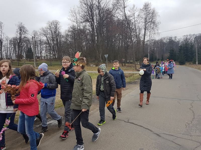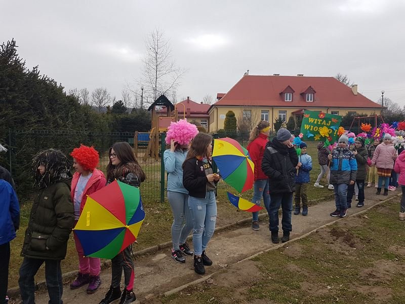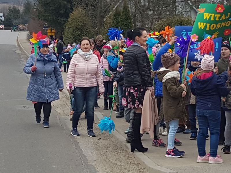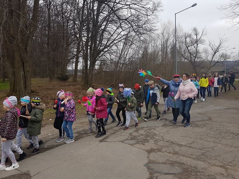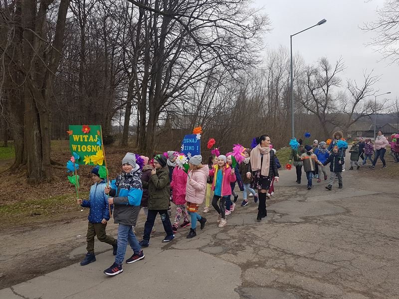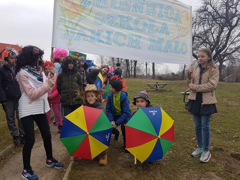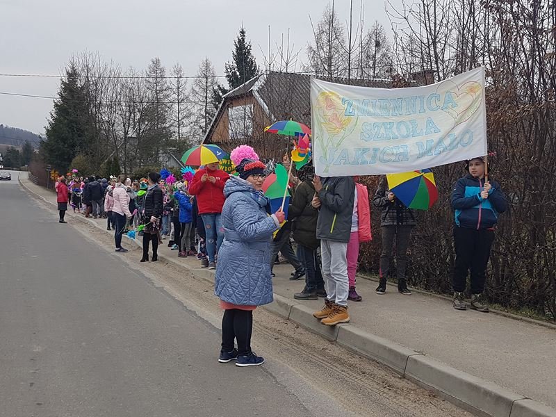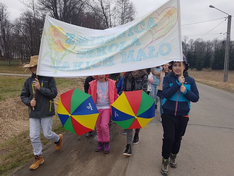 Nie zawsze pogoda zgadza się z podanymi informacjami i wiosna ociąga się z przyjściem. Dlatego tradycją jest, aby wiosnę budzić ze snu głośnymi i kolorowymi pochodami. I w naszej szkole, w czwartek 21 marca został zorganizowany taki przemarsz. Uczniowie począwszy od zerówki do klasy siódmej przeszli w barwnym i bardzo hałaśliwym korowodzie ulicami Zmiennicy niosąc hasła zachęcające zimę do ustąpienia miejsca wiośnie. Maszerując śpiewali piosenki i wznosili okrzyki wygrywając na przeróżnych bardziej i mniej tradycyjnych instrumentach. Przywoływali już tak bardzo wyczekiwaną porę roku kiedy przyroda budzi się do życia po zimowym śnie, śpiewają radośnie ptaki i wszystko wokół zaczyna przybierać zielona barwę Po przemarszu z kolorowym gaikiem uczniowie wrócili do szkoły pewni, że wiosna tuż ,tuż ! I wiosna przyszła pieszo, już ptaki za nią śpieszą ,już trawy przed nią rosną i szumią : Witaj wiosno !