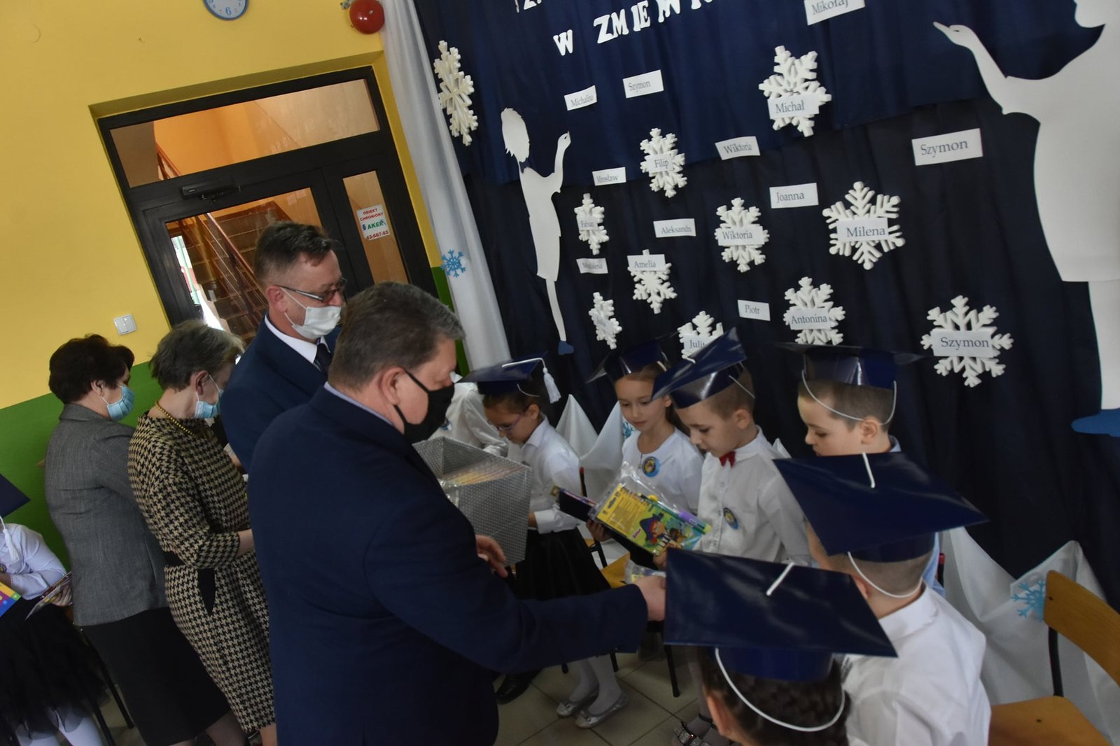 Uroczystość była też okazją do złożenia podziękowań i gratulacji. Ciepłe słowa pod adresem uczniów, nauczycieli i rodziców skierował Waldemar Och- sekretarz gminy, przekazując dzieciom wspaniałe prezenty ufundowane przez burmistrza Brzozowa. Uczniowie klasy I otrzymali również małe upominki od rodziców oraz od kolegów i koleżanek z klasy II i III.