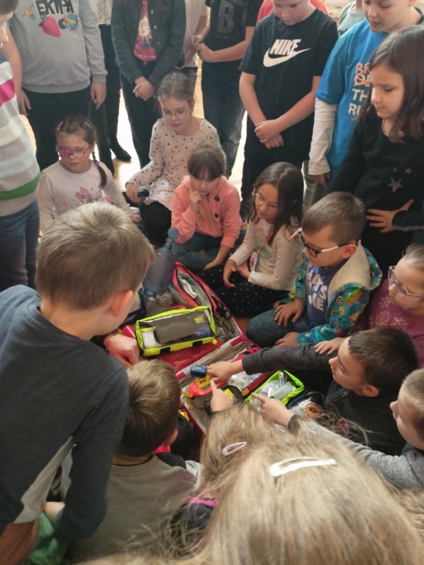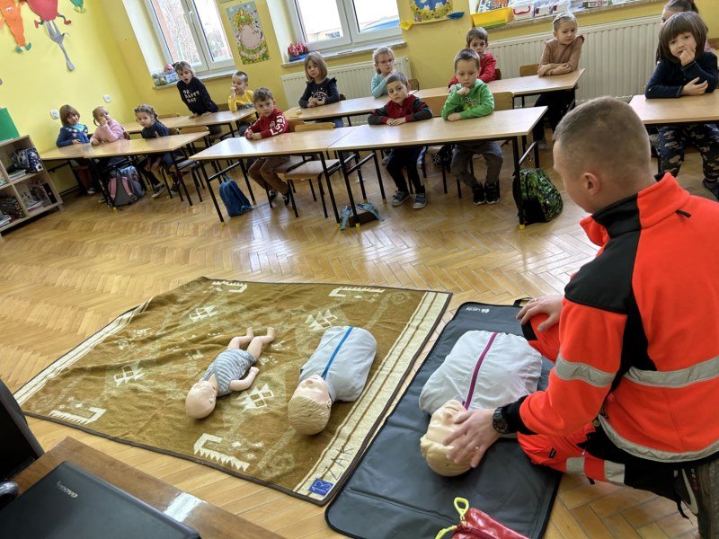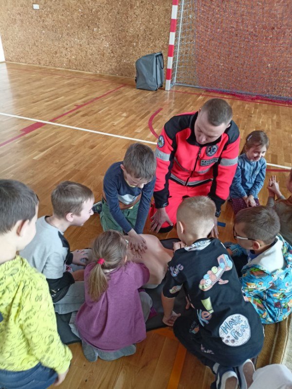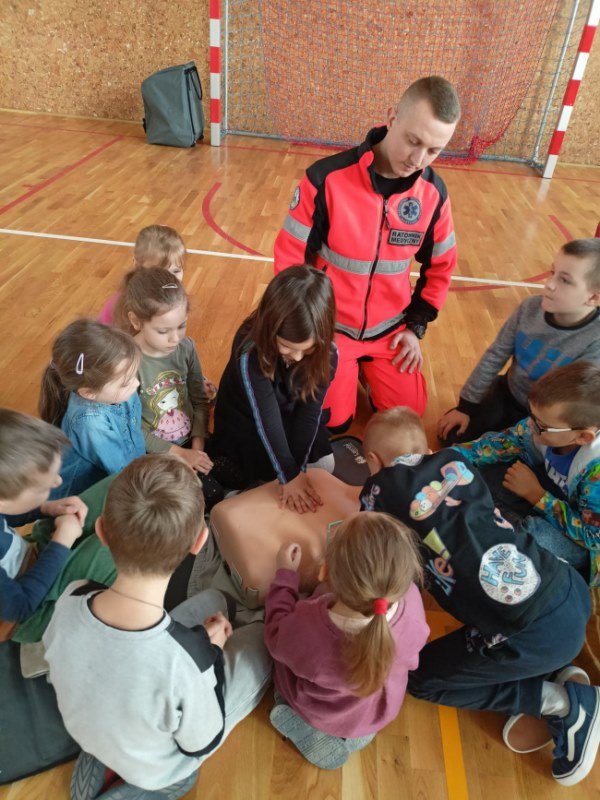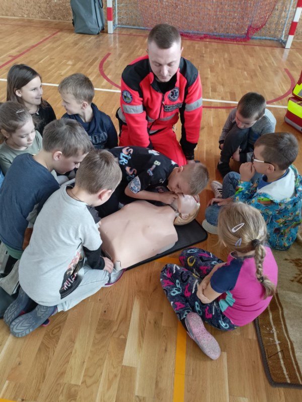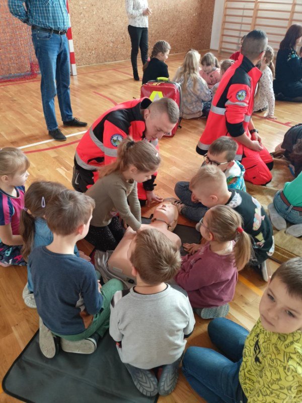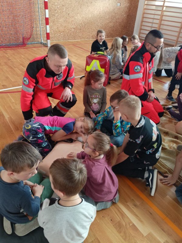 Na spotkaniu Goście udzielili instruktażu oraz zademonstrowali tok postępowania podczas udzielania pierwszej pomocy w nagłych wypadkach. Panowie ratownicy uświadomili uczniom, na czym polega ich praca i jak należy zachować się w nagłych wypadkach do momentu pojawienia się fachowej pomocy medycznej. Przypomnieli dzieciom ważne telefony alarmowe. Pokazali również jak ułożyć osobę nieprzytomną w pozycji bocznej ustalonej jako pozycji bezpiecznej dla osoby poszkodowanej. Dużym zainteresowaniem uczniów cieszyły się wskazówki związane z masażem serca i sztucznym oddychaniem. Panowie wyjaśnili, dlaczego te czynności są tak ważne w pierwszych minutach. Opowiedzieli uczniom, jak stwierdzić, czy osoba poszkodowana straciła przytomność oraz jak sprawdzić czy oddycha. Pokazali wyposażenie torby medycznej oraz omówili zastosowanie defibrylatora.