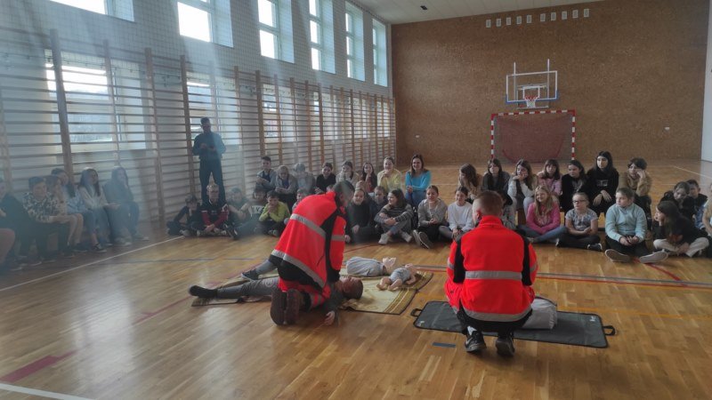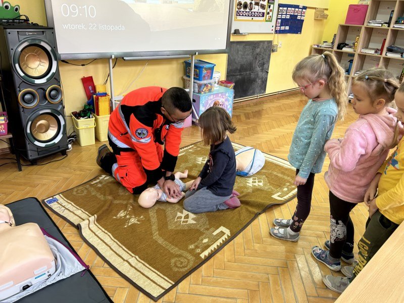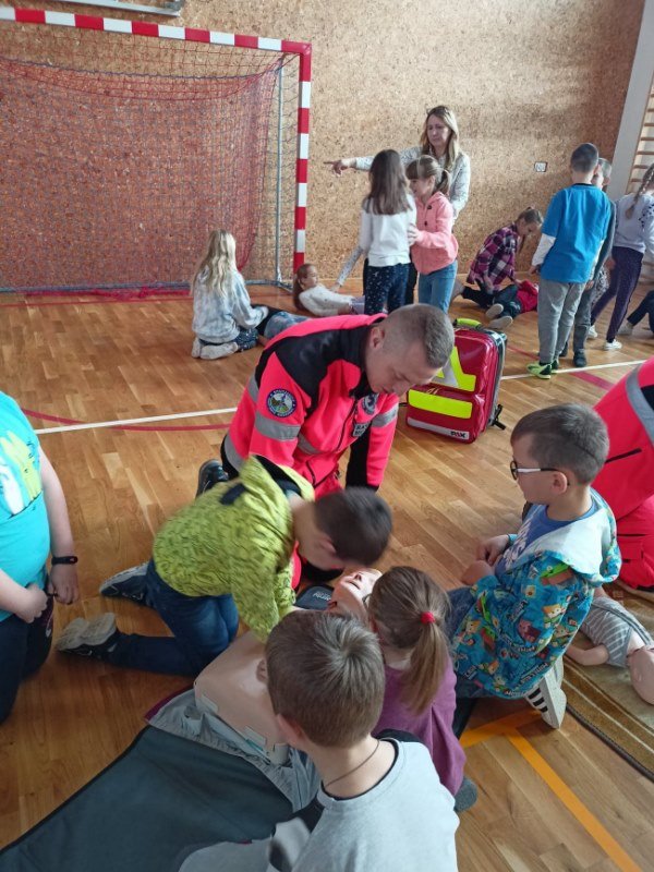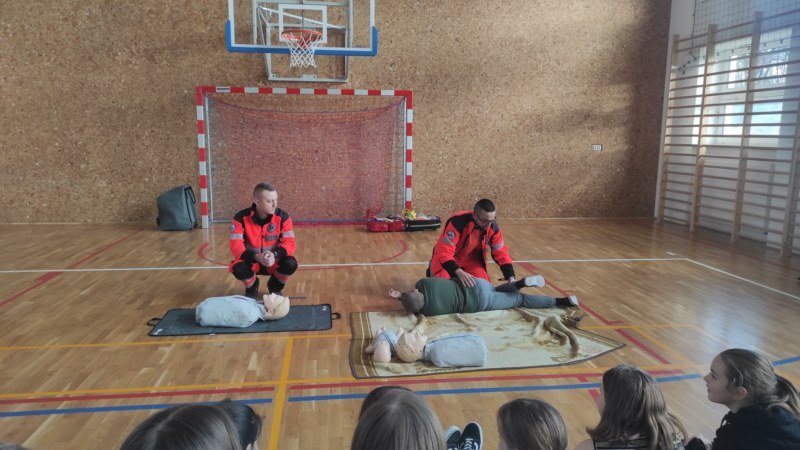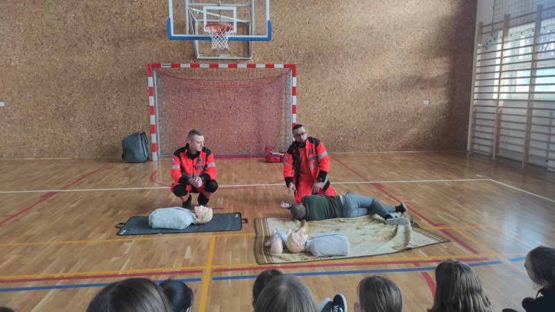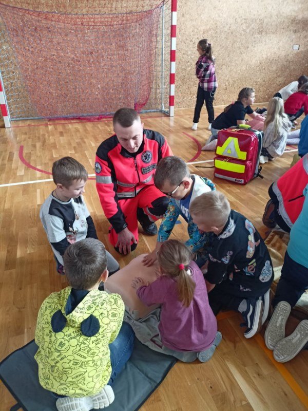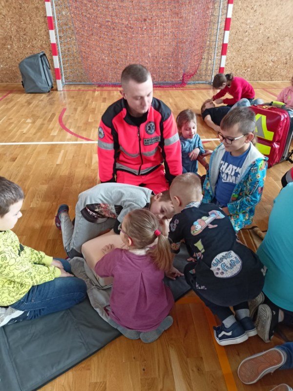 Na spotkaniu Goście udzielili instruktażu oraz zademonstrowali tok postępowania podczas udzielania pierwszej pomocy w nagłych wypadkach. Panowie ratownicy uświadomili uczniom, na czym polega ich praca i jak należy zachować się w nagłych wypadkach do momentu pojawienia się fachowej pomocy medycznej. Przypomnieli dzieciom ważne telefony alarmowe. Pokazali również jak ułożyć osobę nieprzytomną w pozycji bocznej ustalonej jako pozycji bezpiecznej dla osoby poszkodowanej. Dużym zainteresowaniem uczniów cieszyły się wskazówki związane z masażem serca i sztucznym oddychaniem. Panowie wyjaśnili, dlaczego te czynności są tak ważne w pierwszych minutach. Opowiedzieli uczniom, jak stwierdzić, czy osoba poszkodowana straciła przytomność oraz jak sprawdzić czy oddycha. Pokazali wyposażenie torby medycznej oraz omówili zastosowanie defibrylatora.