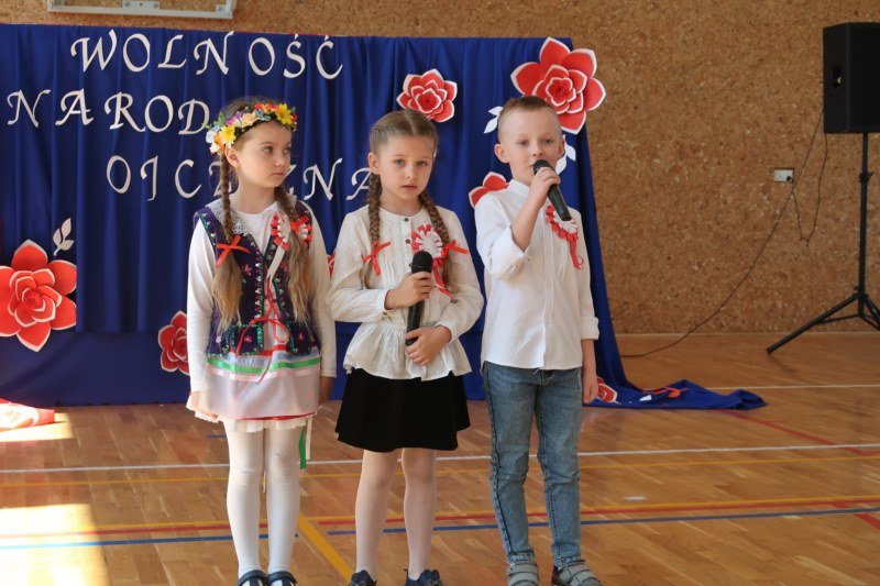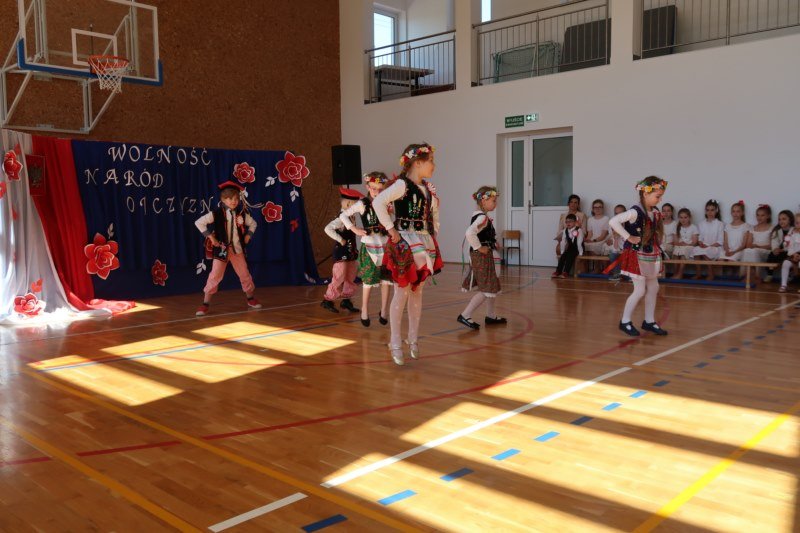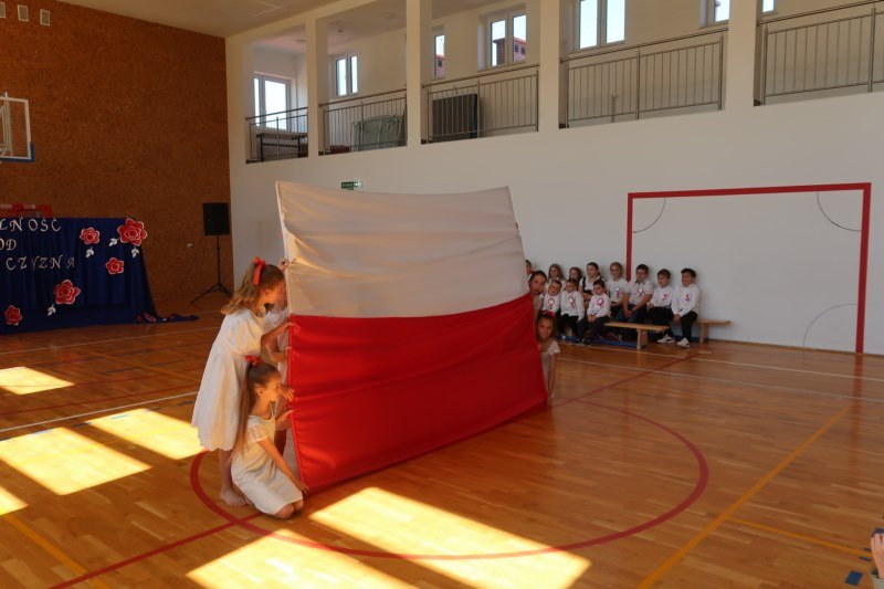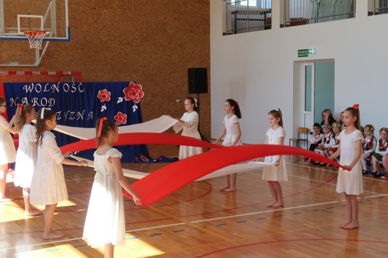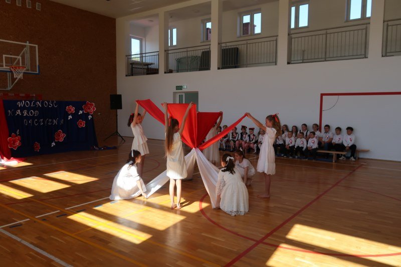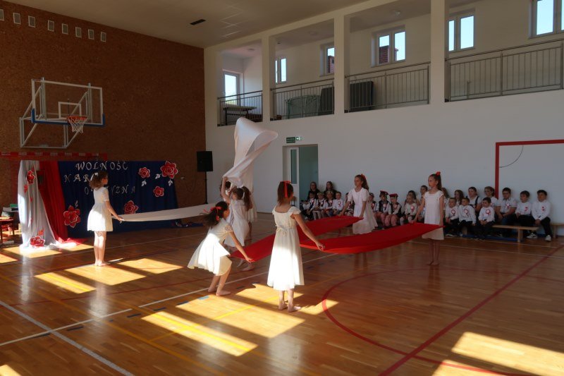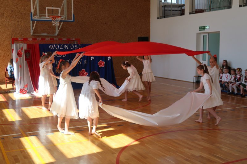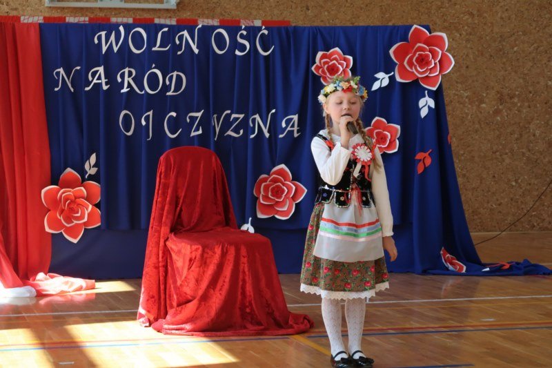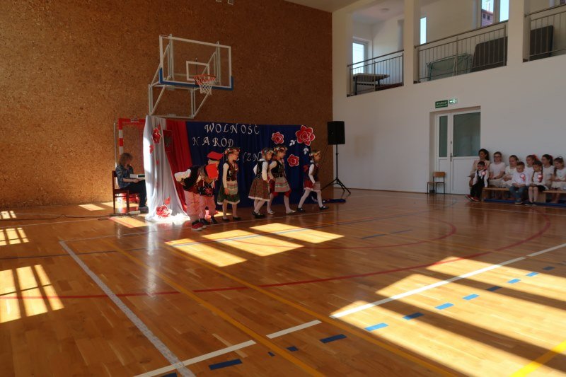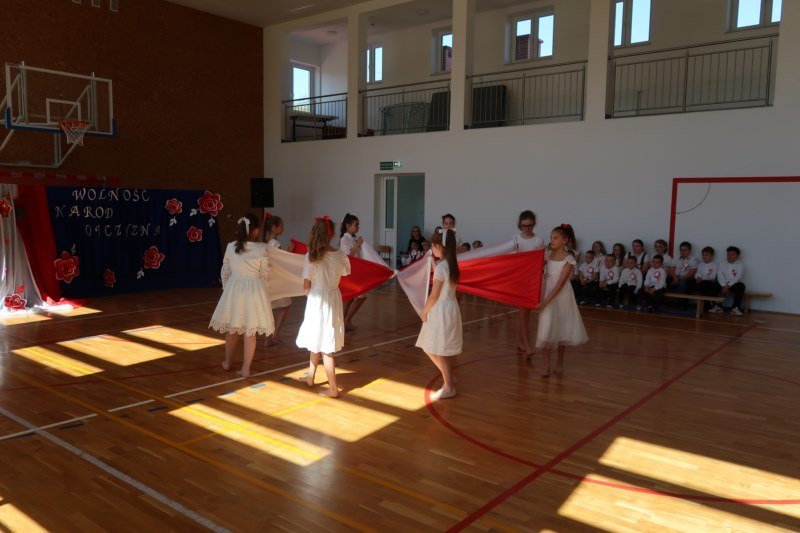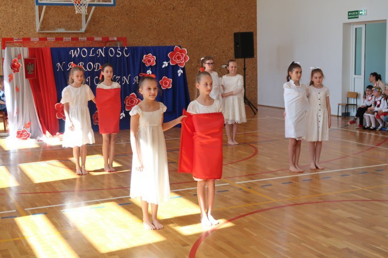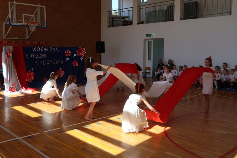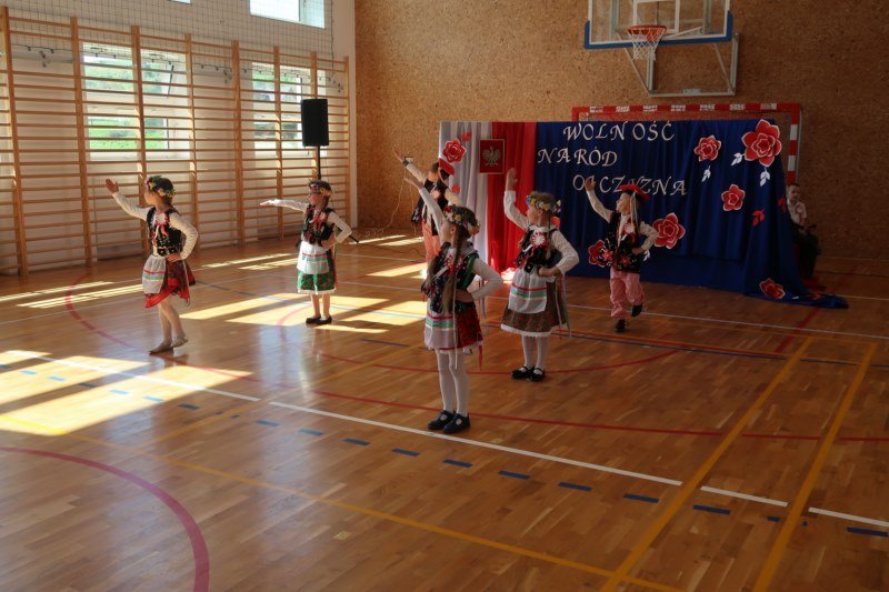 Uczniowie naszej szkoły chętnie i z zaangażowaniem udowodnili, że może być inaczej. Przygotowali wraz z opiekunami program artystyczny, który w prostych słowach ukazał, iż naród który nie zna swojej przeszłości umiera i nie buduje przyszłości. Podjęto wspólnie próbę odpowiedzi na pytania czym dla nas jest Ojczyzna, Naród i Wolność.... Oprócz krótkiego rysu historycznego moglismy obejrzeć układ taneczny z elementami krakowiaka w wykonaniu dzieci z zerówki pod opieką p.Haliny Wojtowicz oraz widowisko muzyczne pt. "Flaga Polski" w wykonaniu uczennic z klasy IV pod opieką p.Edyty Szul. Dziękujemy także Paniom Renacie Drozdowskiej za oprawę muzyczną i Monice Rachwal, która wykononała dekoracje. Nad całością uroczystości czuwała p.Malgorzata Ścibor.