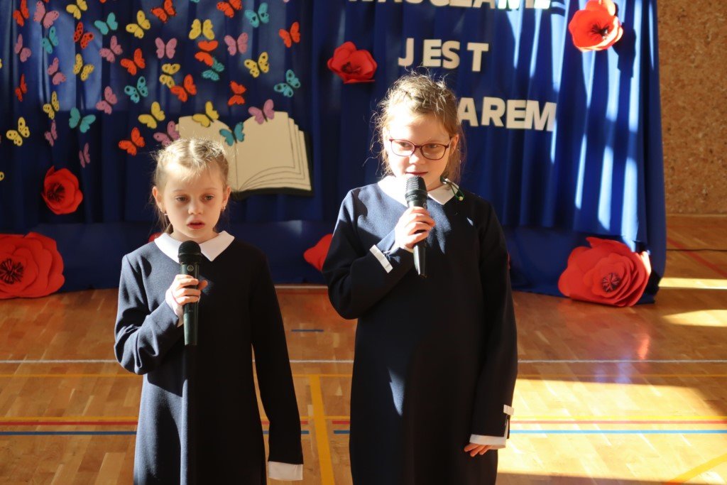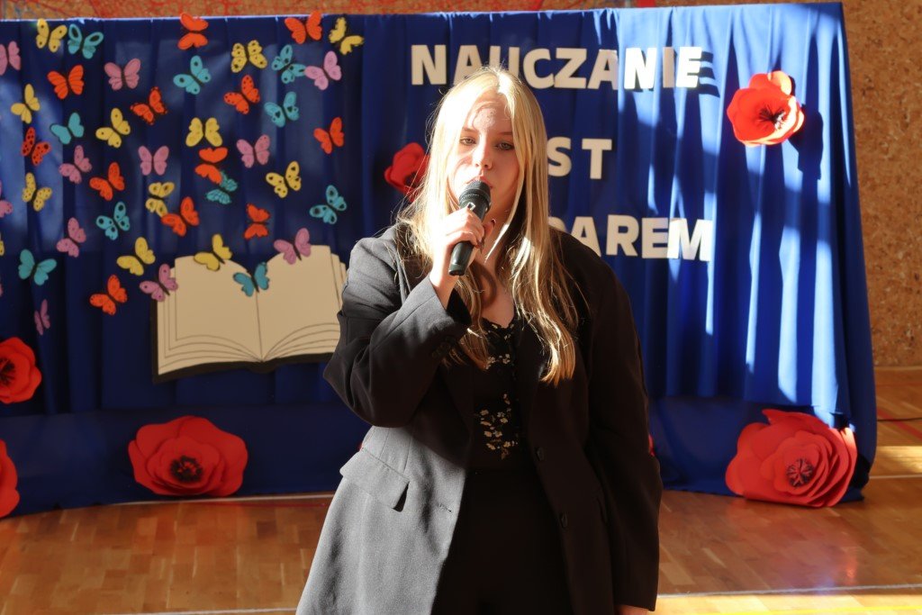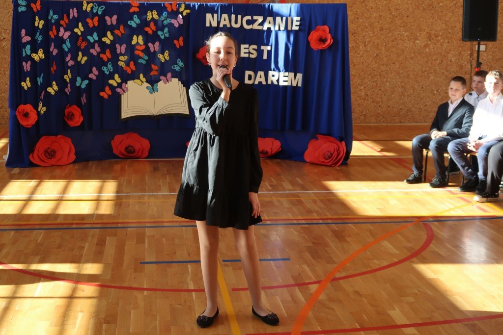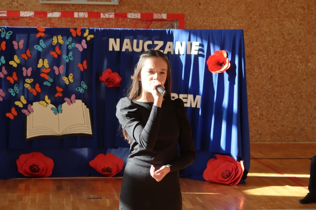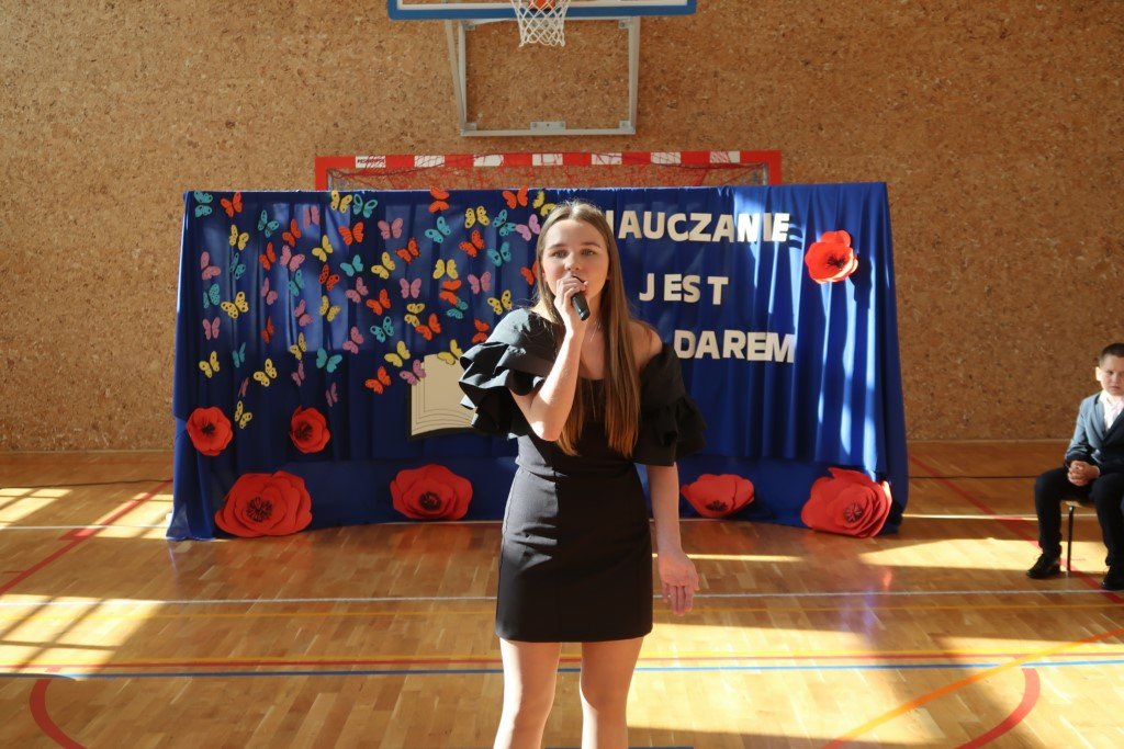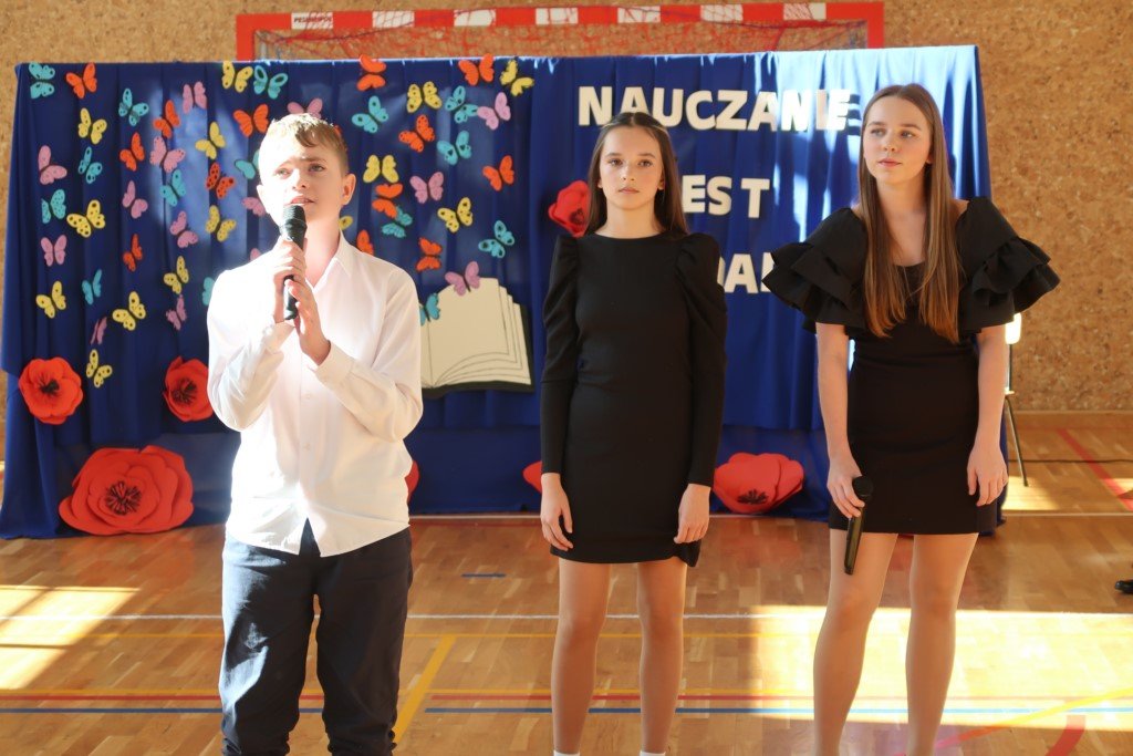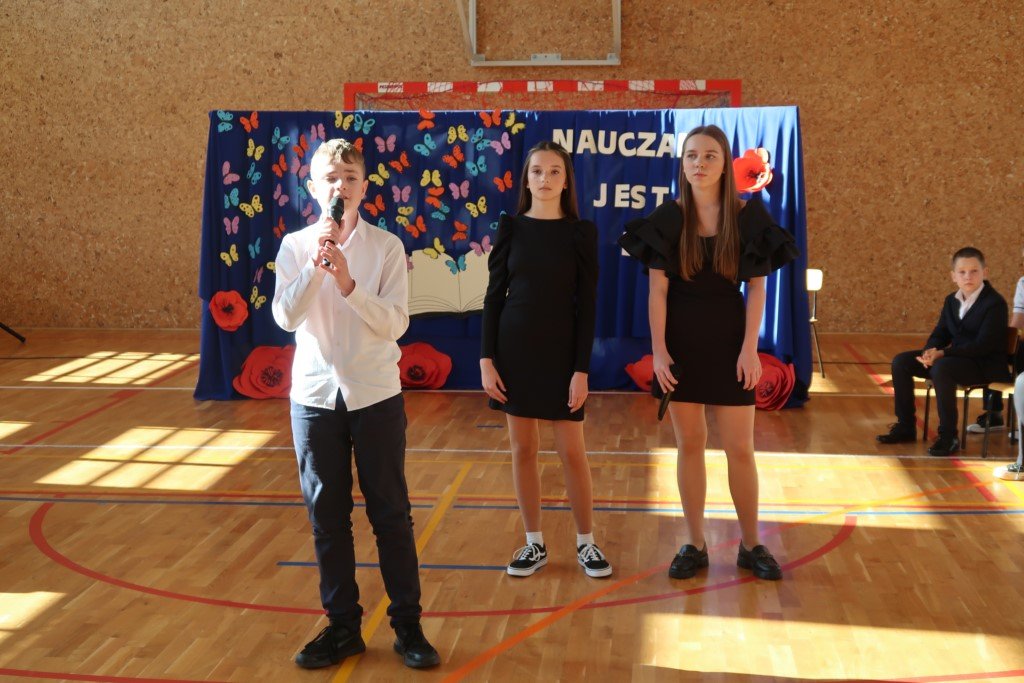 Zebranych przywitałprzewodniczący Samorządu Uczniowskiego–Oskar Rachwał, która zaprosił na krótki montaż słowno – muzyczny. W rolę konferansjerów wcielili się Aleksandra Krynicka oraz Filip Adamczak. To oni w imieniu wszystkich uczniów wyrazili wdzięczność za trud wychowania i nauczania. Wspomnieli, że uczyć to nie tylko mieć wpływ na życie swoich uczniów oraz wnieść w nie odmianę, ale uczyć DOBRZE to znaczy wierzyć w to, czego się uczy i w tych, których się uczy. Wszyscy zdają sobie sprawę, że nauczanie to misja, którą dobrze i z zaangażowaniem może wypełniać tylko osoba z prawdziwym powołaniem, dla której wybór tego zawodu nie był przypadkiem.Podczas przedstawienia można było usłyszeć piękne piosenki w wykonaniu naszych utalentowanych uczniów, które stanowiły bukiet wdzięczności nie tylko dla nauczycieli, ale też pracowników administracji i obsługi, bez których sprawne funkcjonowanie szkoły byłoby niemożliwe. Na uwagę zasługiwała przepiękna dekoracja wykonana przez Małgorzatę Wojtuń wraz uczniami. Serdeczne podziękowania należą się także wszystkim osobom, które zaangażowały się w to przedsięwzięcie – Małgorzacie Wojtuń, Agnieszce Leń oraz Renacie Drozdowskiej.