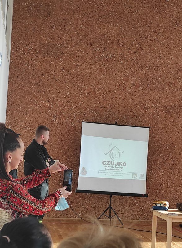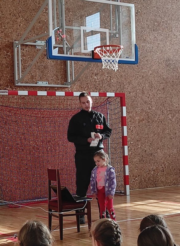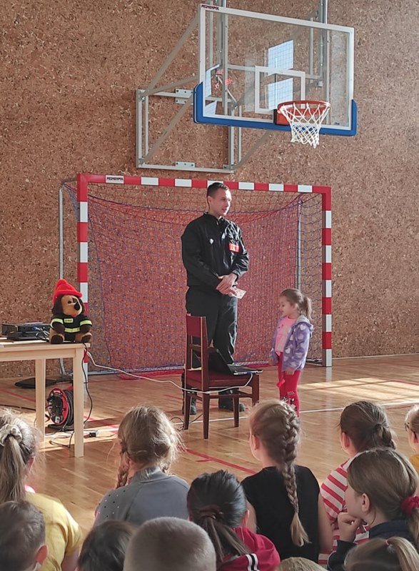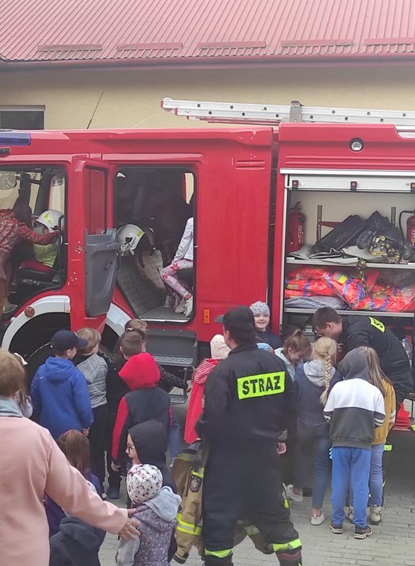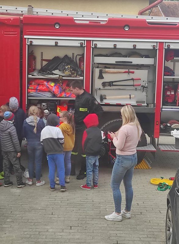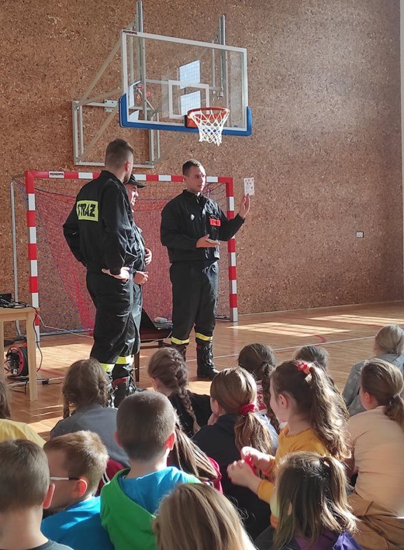 Nasi goście zaprezentowali umundurowanie i ekwipunek strażaków oraz pokazali wyposażenie wozu strażackiego. Dzieci mogły wejść do wozu, sprawdzić wyposażenie, włączyć sygnały dźwiękowe i przez chwilę poczuć się jak strażacy podczas akcji. Zainteresowanie było ogromne. Druh Dawid Nowak podczas pogadanki w sali gimnastycznej szczególną uwagę zwrócił na czad, który jest uważany za „cichego zabójcę”. Dzieci dowiedziały się, skąd się bierze ten groźny, niebezpieczny gaz i jakie są objawy zatrucia. Okazało się, że praca strażaków nie ogranicza się wyłącznie do gaszenia pożarów. Straż Pożarna pomaga ludziom podczas wypadków samochodowych oraz prowadzi wiele innych działań, które służą ludziom i ich bezpieczeństwu. Interwencje te są bardzo niebezpieczne i wymagają niecodziennej odwagi. Nasz gość zaprezentował większość treści w atrakcyjnej formie dla dzieci – prezentacji multimedialnej.