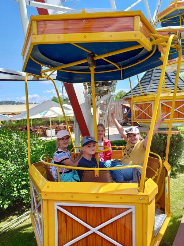 Ze Zmiennicy wyjechaliśmy o 7:00, a o godzinie 11.00 byliśmy u celu naszej podróży. Już na wejściu, na placu pod Basztami powitał nas Jędrek Wróbel – rabczański wynalazca. Uczniowie wzięli udział w lekcji, podczas której poznali oryginalną historię powstania parku. Następnie odbyli warsztaty manualne, każde dziecko z pomocą animatora wykonało swój indywidualny projekt. Po pożegnaniu z animatorami nadszedł czas na upragnioną zabawę na karuzelach i korzystanie ze wszystkich atrakcji Rabkolandu. Pogoda dopisała, co było dodatkowym atutem naszej wycieczki. Wróciliśmy